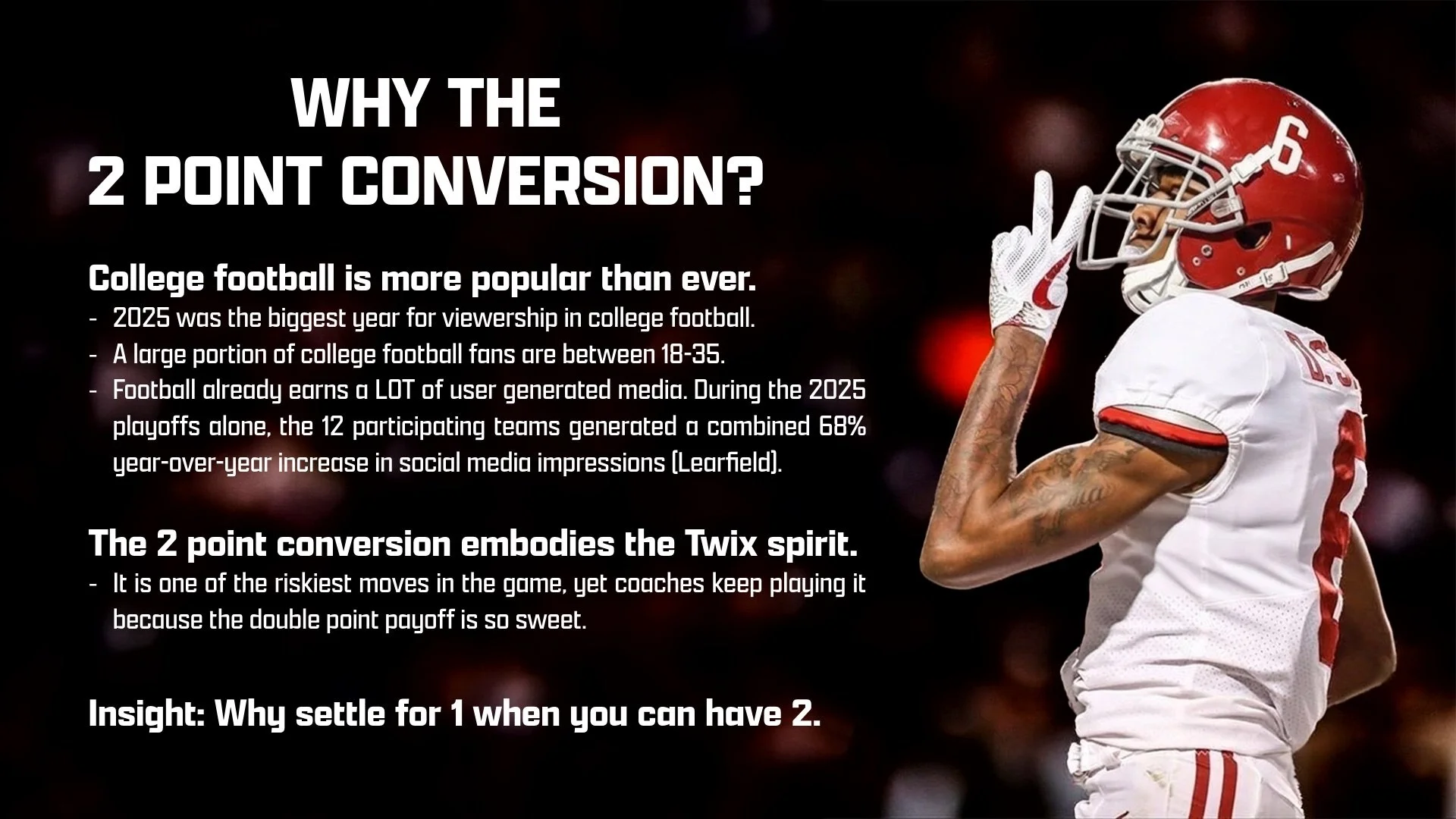 Twix wants to be known as the brand of twos. One is fine, but two is better. So to bring that spirit to life, Twix sponsors the two-point conversion for the entire 2026 college football season—because why settle for one when you can have two?